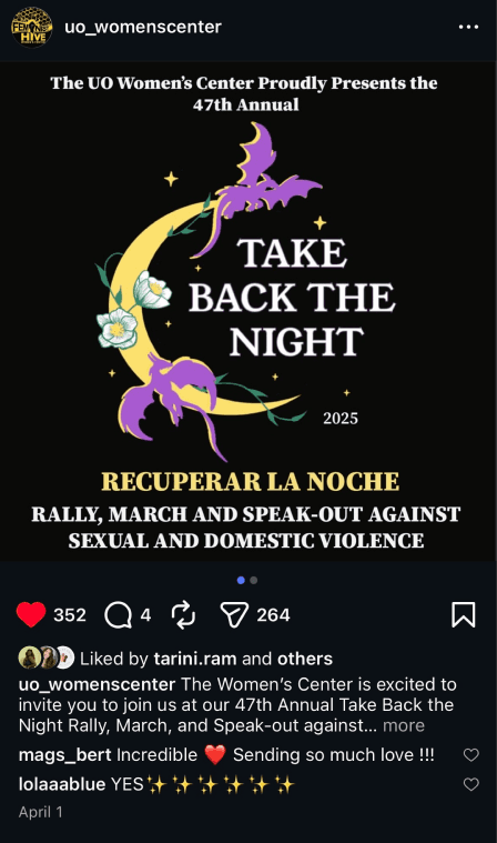 I co-lead the design of the 2025 Take Back The Night campaign, a yearly international protest raising awareness about sexual and domestic violence on campus. I co-created a t-shirt design, pamphlets, Instagram post, a TV spot design, and a poster. The event had 200+ attendees, 300+ likes, and 200+ shares on Instagram, leading to a 27% increase in likes and 97% increase in shares compared to last years Take Back The Night.