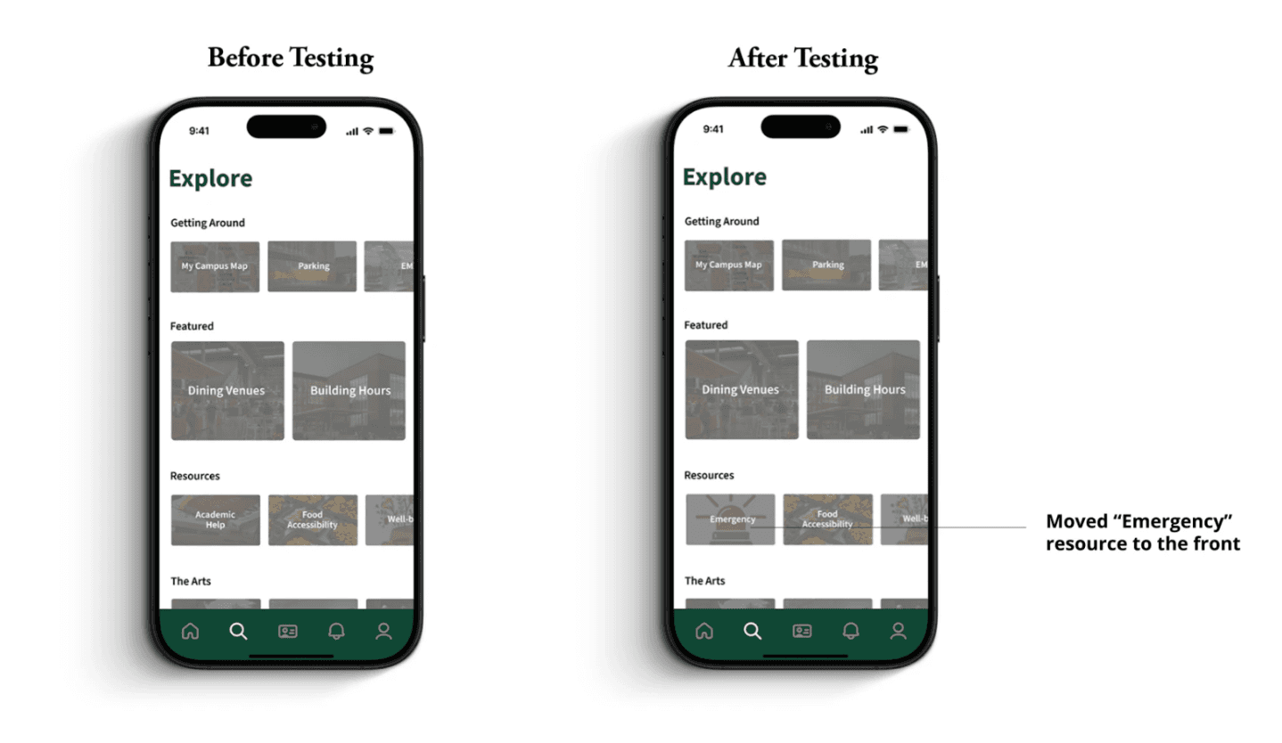 The redesign improved task completion, clarified navigation, and reduced friction in everyday campus moments.
