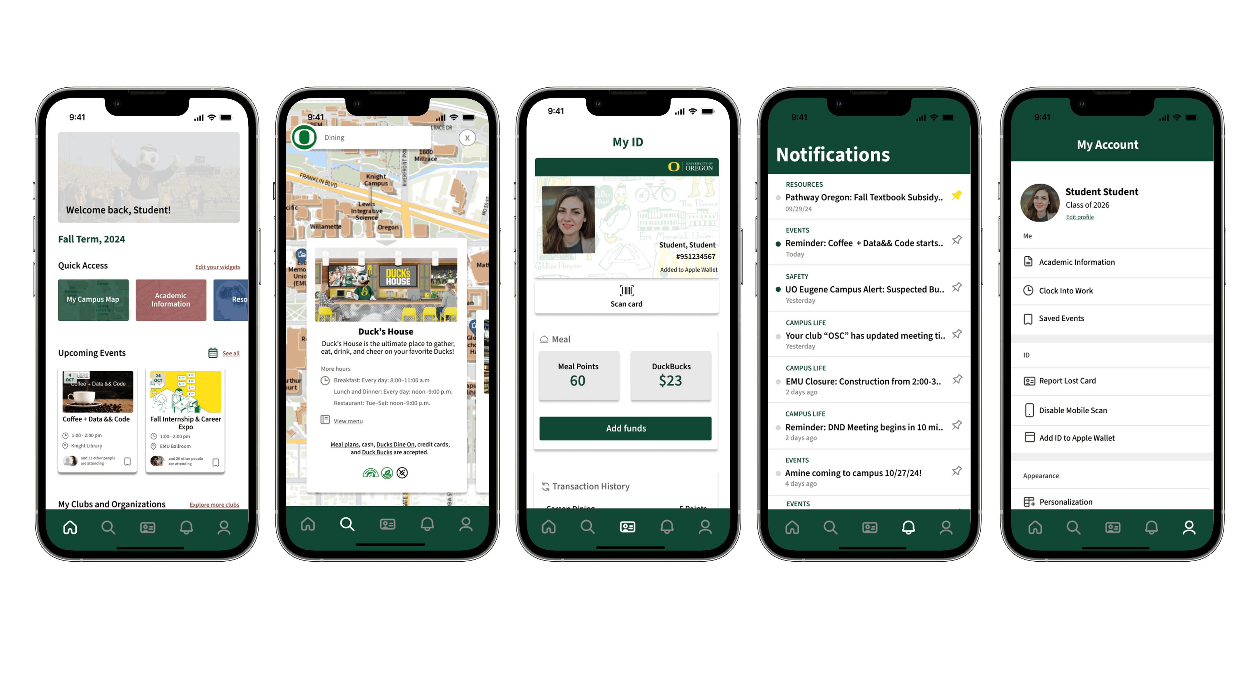 I led the end-to-end research and redesign of the UOregon app to address a core issue: students weren’t struggling with features, they were struggling with fragmentation. Through interviews, card sorting, competitive analysis, and usability testing, I uncovered how students navigated campus through disconnected systems: physical IDs, DuckWeb, external browsers, and separate apps. I restructured the app into a centralized ecosystem that unified dining, events, academics, safety, and mobile ID into one seamless platform.