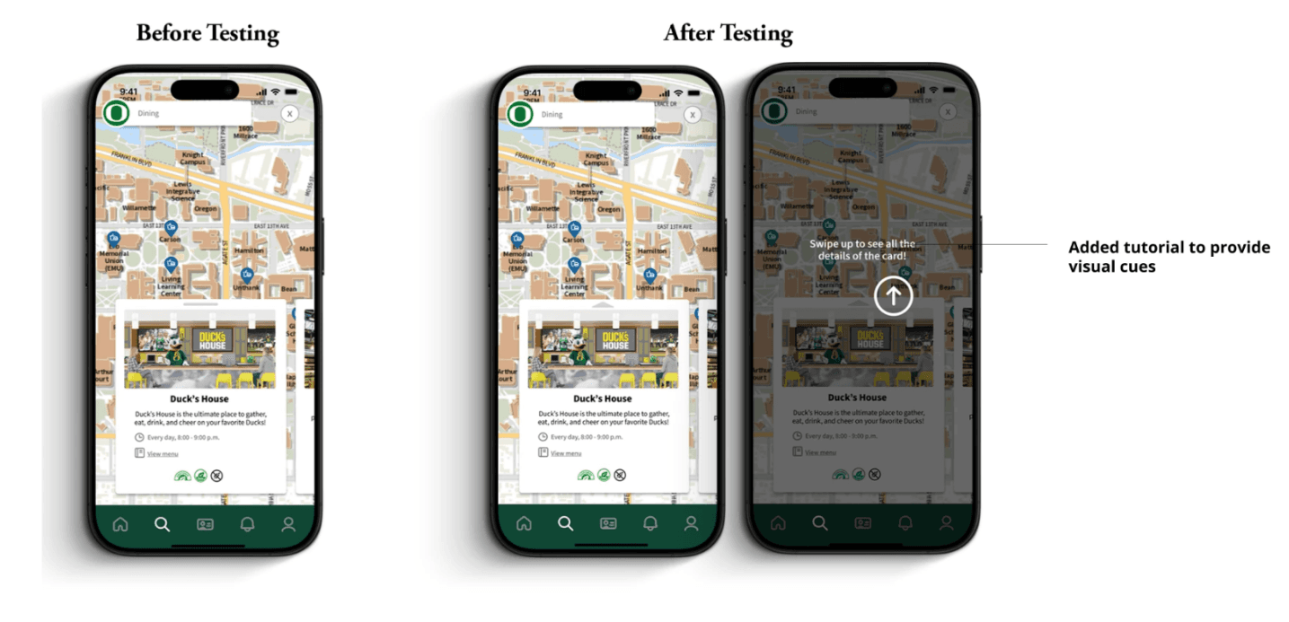 My participants ignored the slider feature, missing out on more information about the dining hall. To increase the visibility, I changed the slider to an arrow and included instructions to swipe up for first-time users.
